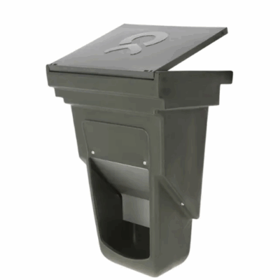 Praktische kunststof krachtvoerbox voor kalverhutten, geschikt voor het combineren van hooi en krachtvoer. Voorzien van gemoffeld deksel ter bescherming tegen regen, 10 liter blik-inzet voor krachtvoer en kunststof ophanghaken voor eenvoudige montage. Compact en stabiel ontwerp voor efficiënt en hygiënisch voeren van kalveren.