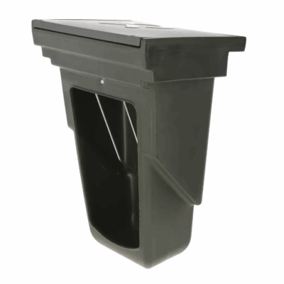 Compacte combi-voerbox van kunststof voor kalverhutten, geschikt voor gecombineerd voeren van hooi en krachtvoer. Voorzien van gemoffeld deksel ter bescherming tegen regen, verzinkte ruif voor gecontroleerd voeren en kunststof ophanghaken voor eenvoudige montage. Duurzaam, stabiel en ideaal voor dagelijks gebruik in de kalverstal.