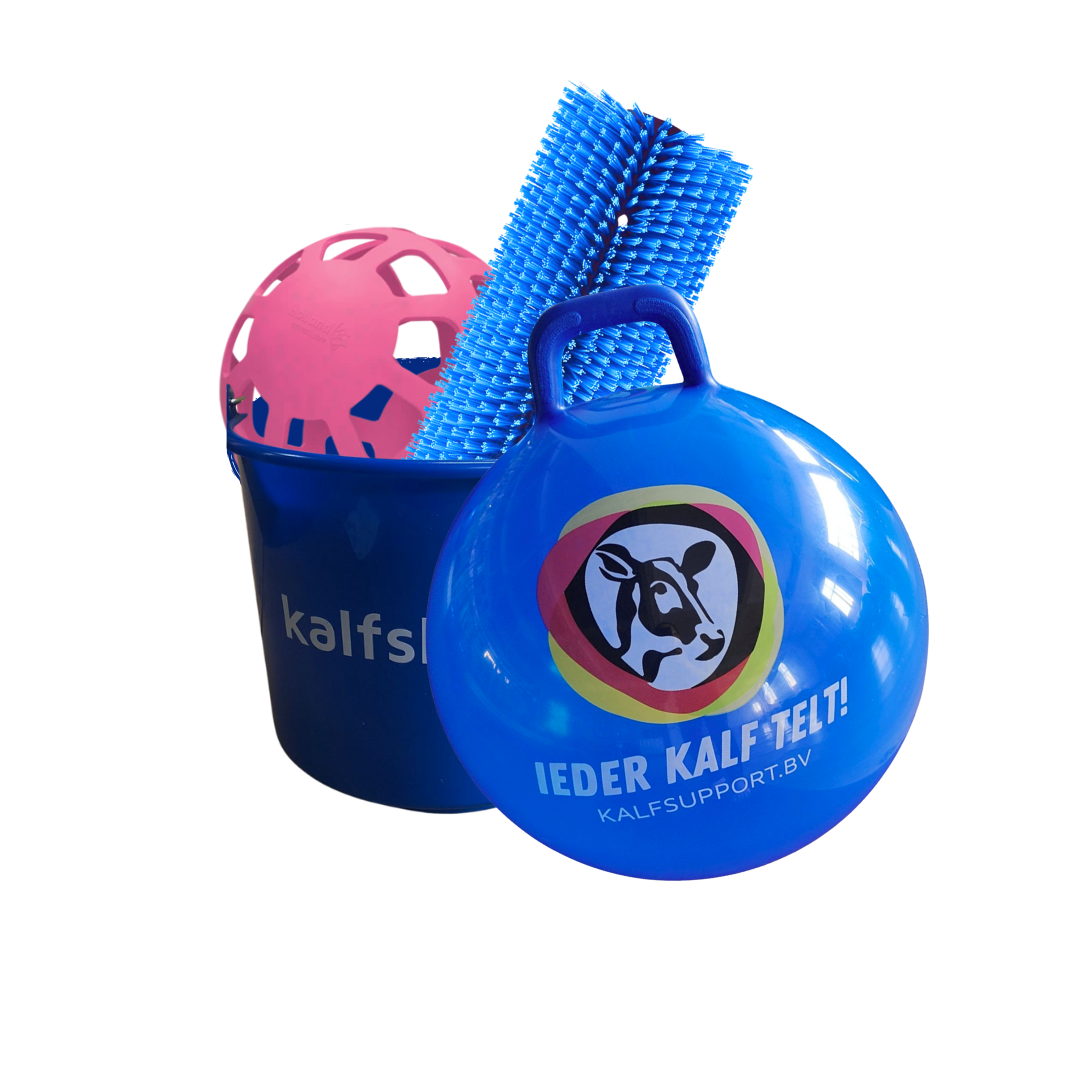 Speelgoedset voor kalveren met schuur/krabborstel, Skippybal, 30 cm hooiruif bal en Kalfshop.nl emmer. Verhoogt welzijn, activiteit en mentale stimulatie in de stal.