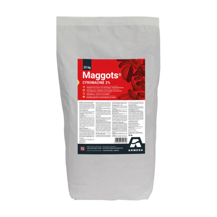 Maggots NL is een krachtig larvicide in de vorm van wateroplosbare korrels, speciaal ontwikkeld om vliegenlarven in stallen effectief te bestrijden. Door de unieke werking als groeiregulator wordt de ontwikkeling van maden onderbroken, waardoor volwassen vliegen nauwelijks kans krijgen zich voort te planten. Dit maakt Maggots NL een onmisbaar hulpmiddel voor veehouders die een hygiënische en gezonde stalomgeving willen behouden.