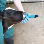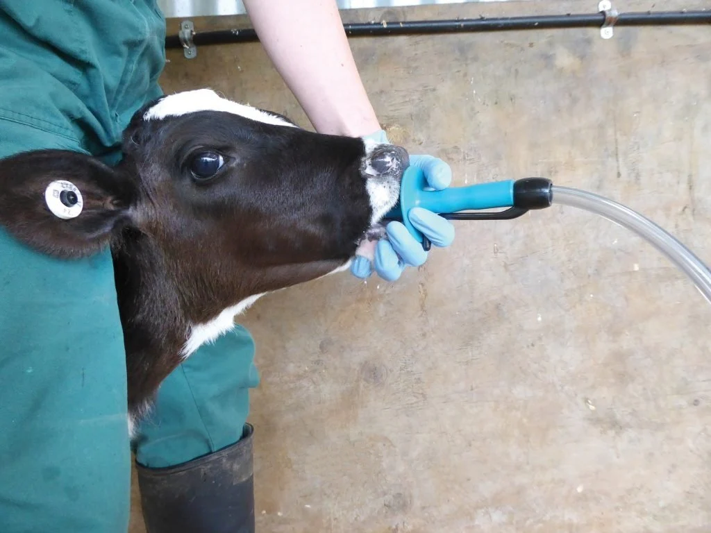 - Plaats het mondstuk zodanig dat de ronde beschermring comfortabel tegen de neus van het kalf zit. Houd met één hand het mondstuk en het handvat vast onder de kin om de sonde makkelijk te begeleiden.